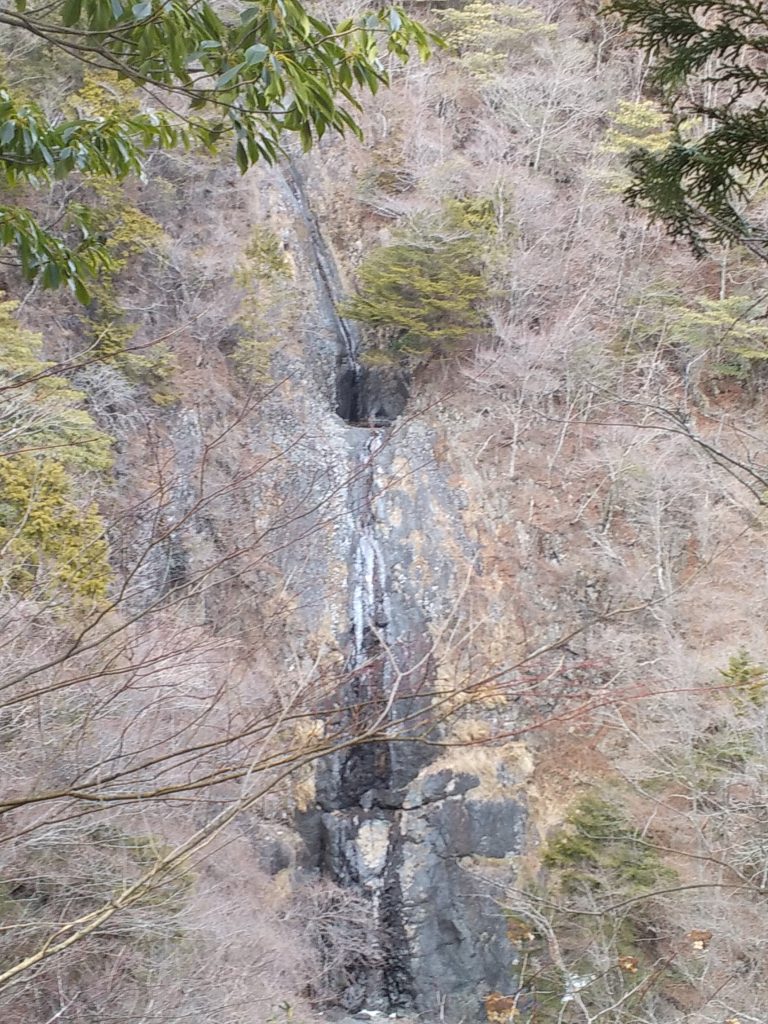 毛無山縦走組もこの先は下りで登りはなくなるので、心の気持ちは軽いが足は疲労からなのか重い。下りがまた、本当に急坂でしたが南面なので雪は解けぎみで日陰は氷に滑らないよう気を付けて歩く。時々、泥んこ祭りで滑りやすい箇所もある。不動の滝は水が凍りついていた。