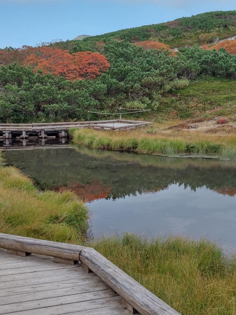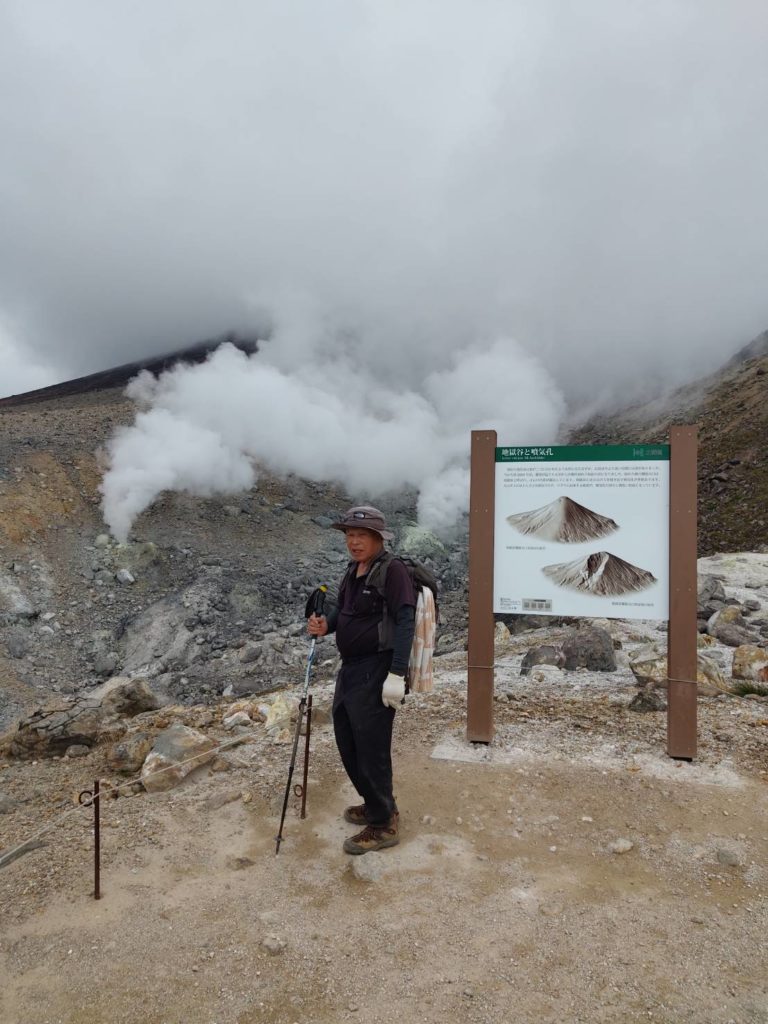 東川町旭岳から姿見の池までロープウェイ利用。 旭岳石室の登路は旭岳山頂まで非常に歩きのくい登山道に細かいジャリ状の石が乗っていて、登りは良いが下りは気を許すと一発で足をすくわれる。二度と登りたく無いのが本音、山頂は天候に恵まれ、360度大雪山連峰の山並が一望に見ることができた。旭岳石室から姿見の池は紅葉が始まりチングルマは真っ赤、ナナカマドは山麓に向って色付いている。旭岳も活火山、間欠泉がい勢いよく吹き出していた。今回の山行はこの歳で北海道は初見参、せめて最高峰だけは足跡だけは残しておきたかった。14.00山麓駅着。