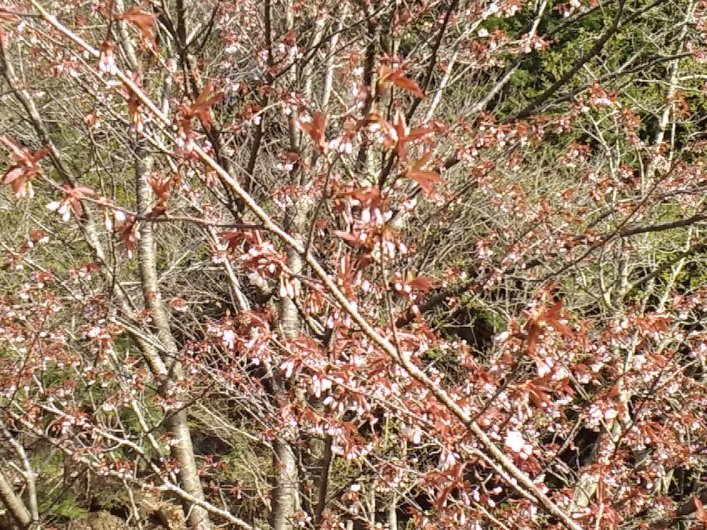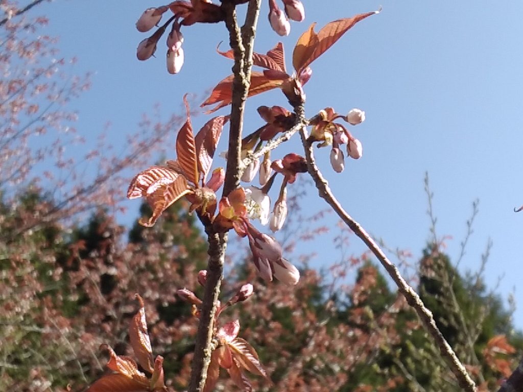 駐車場の約標高800m。山桜のつぼみ。