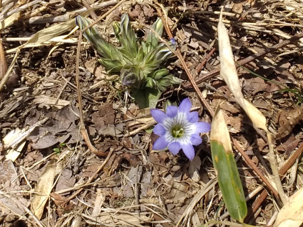 正規のルートへ戻って東雨乞岳を目指します。森林限界を抜けると笹原となって東雨乞岳山頂までは気持ちの良い天空の道であった。振り返れば、鎌ヶ岳と御在所岳が鎮座している。ハルリンドウが迎えてくれ、東雨乞岳へ登頂する。風が少し強かったので1枚羽織ると寒さは吹き飛んだ。