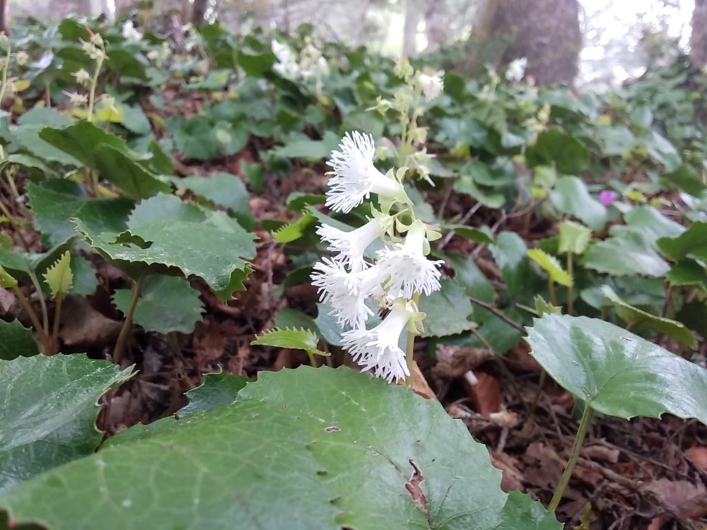 ミツバツツジの紫色を楽しみながら高度を上げます。しばらくするとヤマイワカガミの群生地では、沢山の花が目を楽しませてくれました。白い花が可憐です。