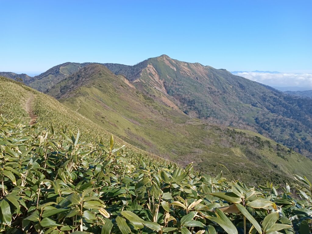 気持ちの良い広葉樹の尾根を登って堂岩山を超えると展望が開けた稜線に出る。