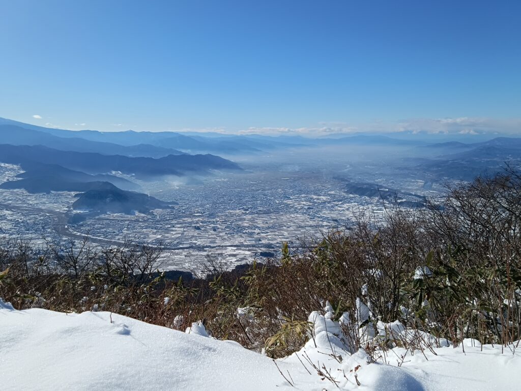 2時間近くかけて頂上に辿り着くと頂上からは、飯縄、戸隠、黒姫、斑尾、妙高などの北信五岳を望む絶景を堪能できる。