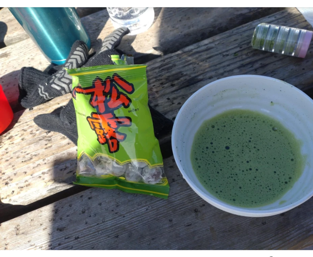 竜ヶ岳山頂に到着してお昼ご飯。メンバーの永井さんから野点の抹茶をいただく。