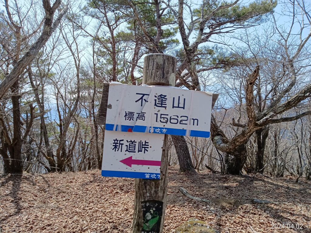 大石峠から稜線を東に15分ほど進み、本日6座目のピークとなる不逢山に登頂。