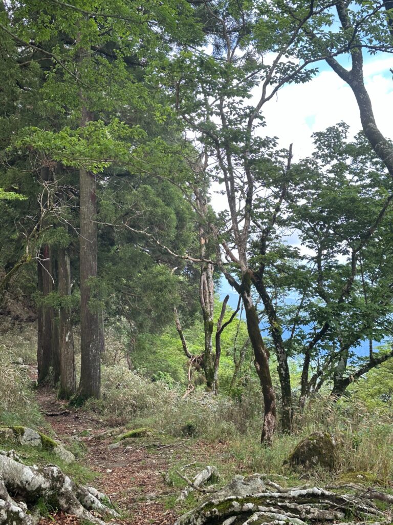 登山道は下草が刈ってあるから広い、岩岳迄は登り一辺道、所々の笹原、安倍川側は静岡市街駿河湾が一望出来るがガスの中、