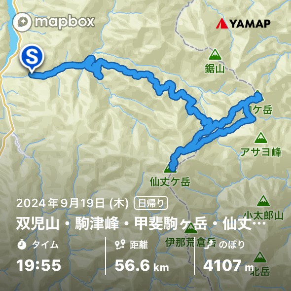 ◎行動概要:仙流荘・戸台パーク(2:05スタート)→[バス林道]→北沢峠(6:19)→甲斐駒ヶ岳・往復→北沢峠(12:31)→仙丈ヶ岳(15:48)→大平小屋(18:43)→[バス林道]→仙流荘・戸台パーク(22:00 ゴール)