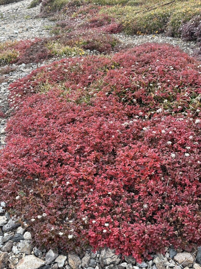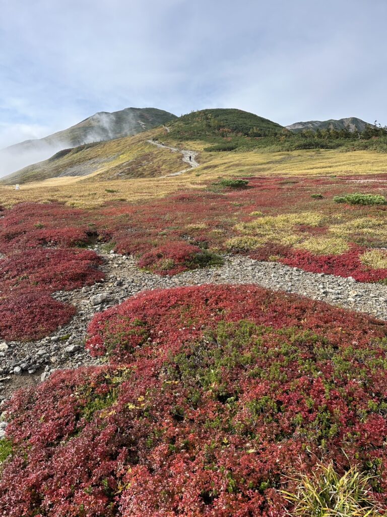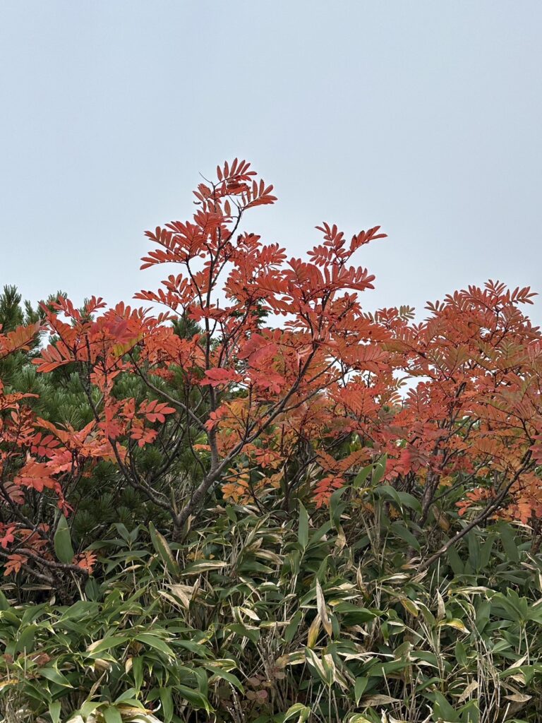 森林帯を抜けると真っ赤なチングルマの紅葉、見覚えのある赤い屋根、白馬大池が鏡のように輝く、絵になる景色だ。10.40、福井は11.00からの受付を済ます、俺は遅いから先に小蓮華山を目指す。2時間程のアルバイト、地獄の特訓。1週間程前2000m峰3座登っているからよぼよぼの爺さんでも高度順応はバッチリ、白馬連峰のなだらかな稜線は登り易い、這松の緑絨毯、真赤なナナカマド、錦織りなす秋の営みは間近。稜線は濃いガスの中、時折ぱらつく、風の身か?12.45、小蓮華山.2766m着、ニセピークに騙されて喘ぎ喘ぎサクセス。30分遅れで我が隊も登頂、永井は2612mピークでリタイア申請、それでも元来の粘り腰で登って来た、若者3パーティ
