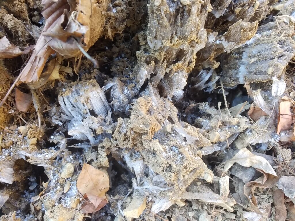 富士山は、山頂が雲に隠れていたが、身支度を済ませて8時45分に出発する。登山道の所々で霜柱ができている。昨晩はかなり冷えた様です。
