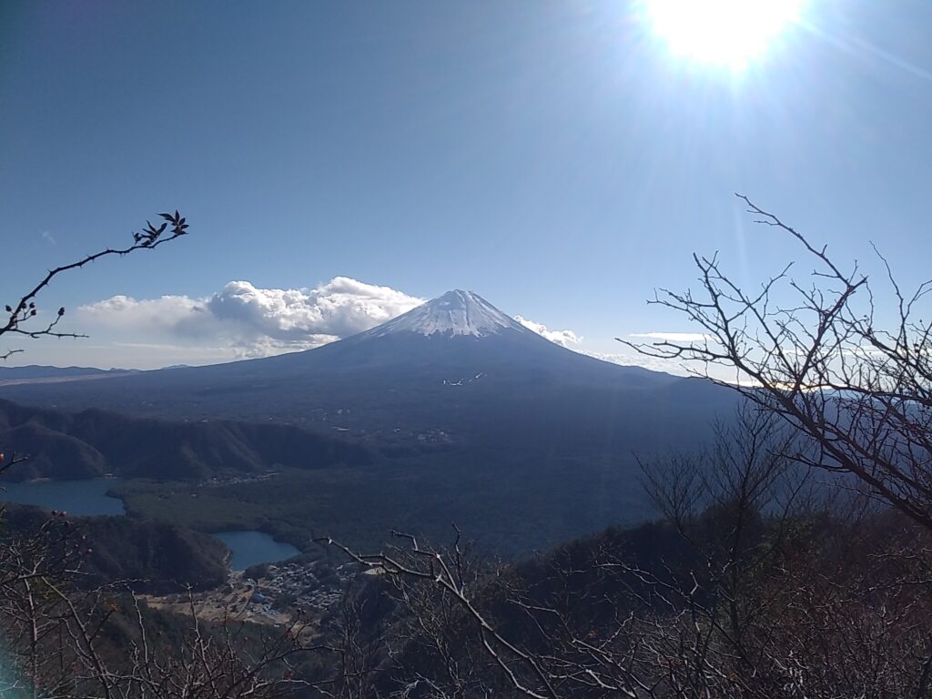 王岳山頂に10時40分に到着。駐車場から休憩を含めて2時間経過。富士山は山頂に雲がまだ掛かっていた。西湖を真下に見下ろし富士山を眺めながら昼食とする。