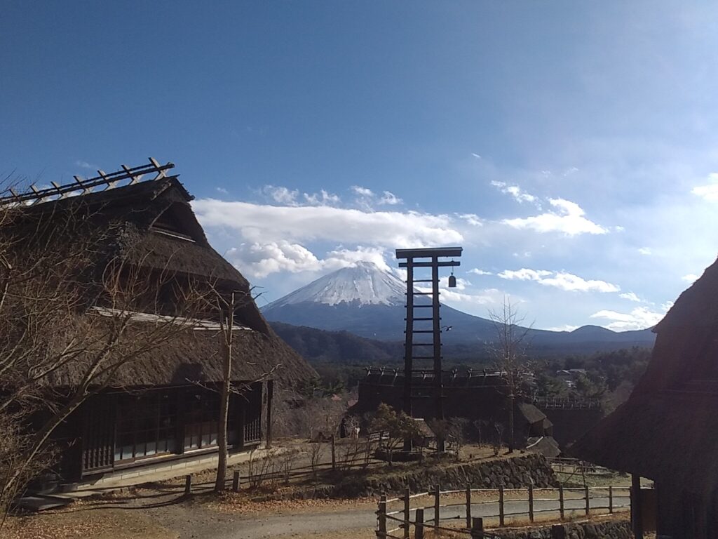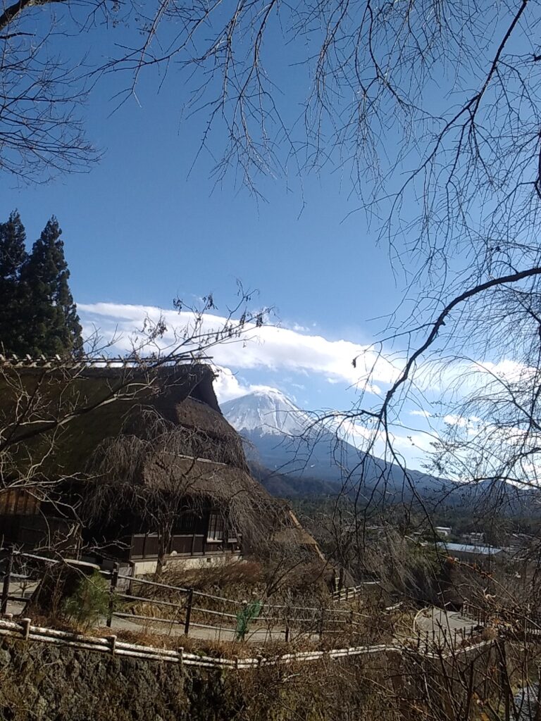 (いやしの里)茅葺き屋根に富士山が絵になる。入場料が500円かかるみたいだが、外から建物の外観は見れる。