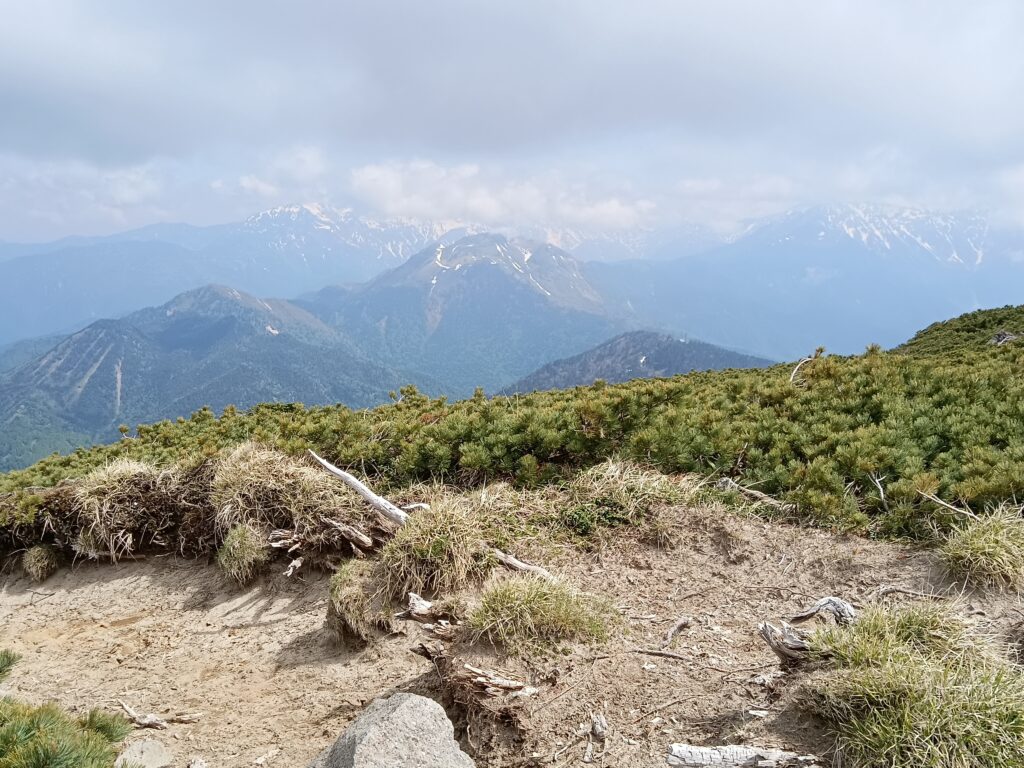 中央手前が焼岳、その左奥が笠ヶ岳、右端が穂高連峰(多分)