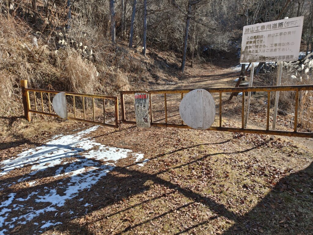 ゆっくり30分歩いてゲートに到着。1台車あり3台駐車可能。ここまでの悪路を考えると下の駐車場から歩くことをお勧め。