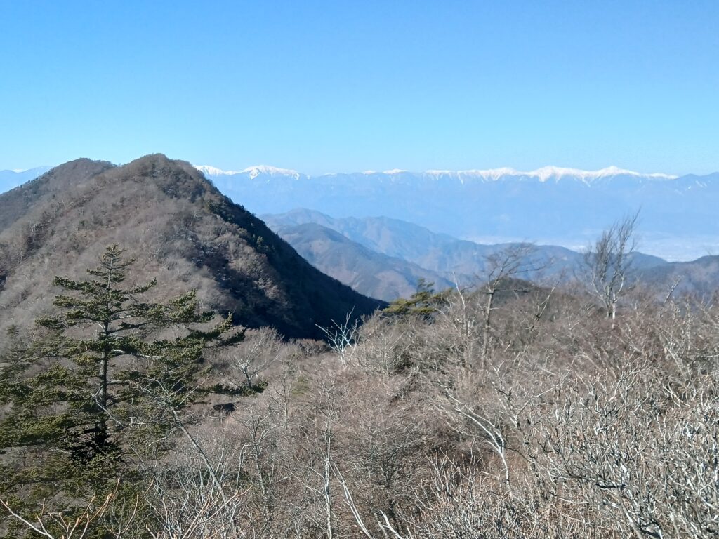 少し先のピークまで登って振り返ると、王岳と南アルプスの峰々を望むことができた。