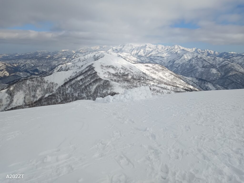 風よけと思われるイグルーの先に白山本峰の峰々を望むことができる。
